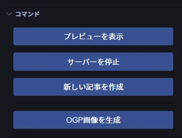 個人的にかなり気に入っている機能です。カスタムスクリプトをコマンドに追加することができます。このブログではAWS LambdaでOGP画像を自動生成するで作成したAWS Lambda関数をコマンドで呼び出せるようにしています。