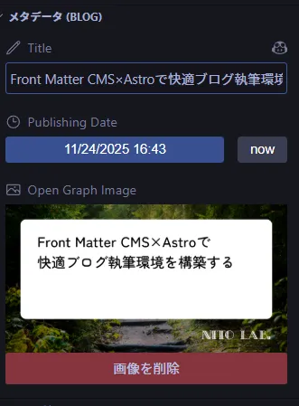 サイドパネルでMarkdownのFront Matterを編集できます。nowを押すと現在時刻(UTC)が自動で入ったり、OGP画像をプレビューできたりします。